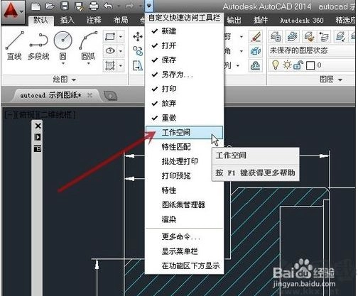 3、在弹出的菜单里,点击“工作空间”(即图中红色箭头所指位置)