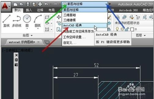4、软件界面的顶端会呈现出一个工作空间选项栏(即图中绿色箭头所指之处),点击该选项栏的下拉三角形(也就是图中蓝色箭头所指位置),然后在弹出的菜单里点击“AutoCAD 经典”(此为图中红色箭头所指内容)
