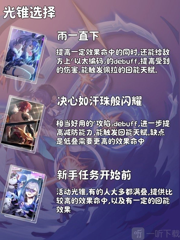 若上述光锥均不具备,可挑选其他能直接提供效果命中的光锥,例如重塑时光之忆、猎物的视线等。就黄泉队伍而言,决心的优先级相对较高。