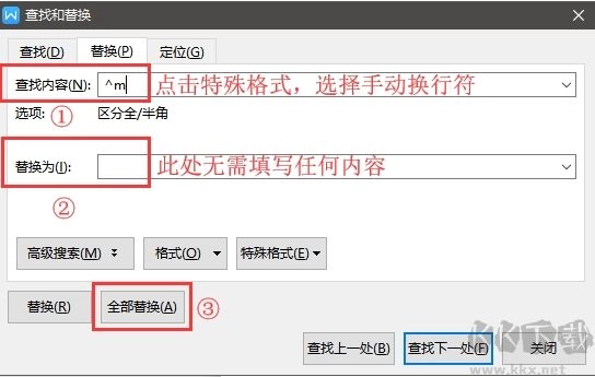 2、此时,我们只需按住“Ctrl + H”组合键,即可调出查找替换框。在框内,点击“查找内容”,接着在下方找到“特殊格式”并选中,从中选择“手动分页符”(^m)。注意,“替换”一栏无需输入任何内容,最后点击“全部替换”,如此一来,所有的空白页便都被成功删除了。