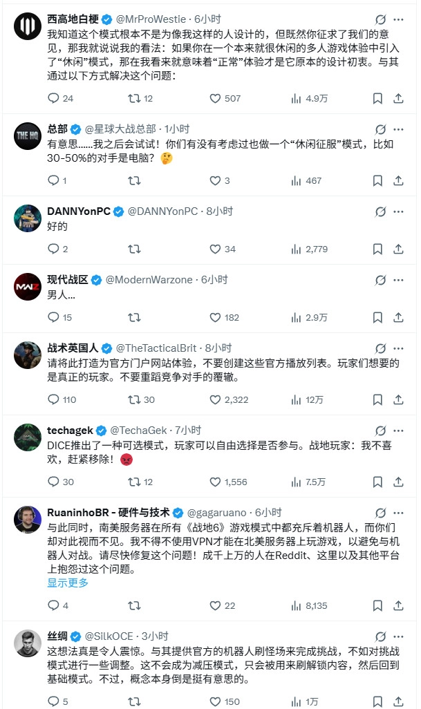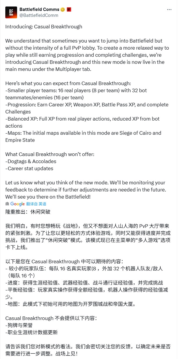 《战地》的死忠粉丝们始终觉得这类模式理应只出现在门户模式里,不过现在它终究还是来了。EA在《战地6》中新增了“休闲突破”模式,该模式里填充了机器人bot,玩家在完成挑战、解锁各类内容的过程中,还能获取生涯经验、武器经验以及战斗通行证经验值。