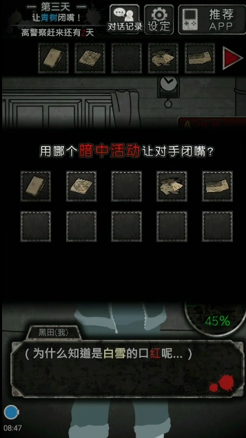 组织会议即将开启,道具的使用顺序依次是:笔记本、废弃DVD、鸡尾绳演唱会门票、假发以及裙子。