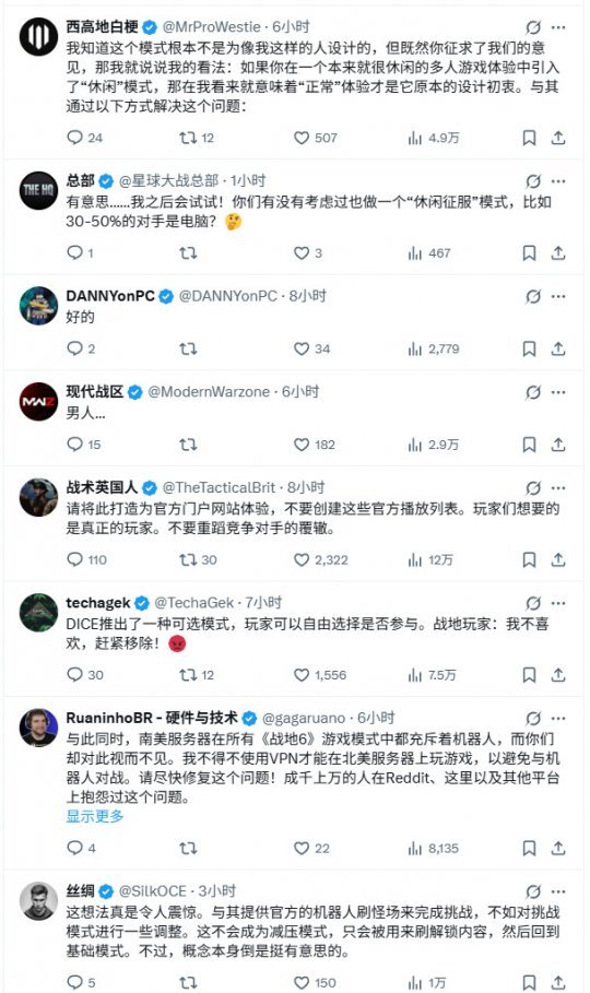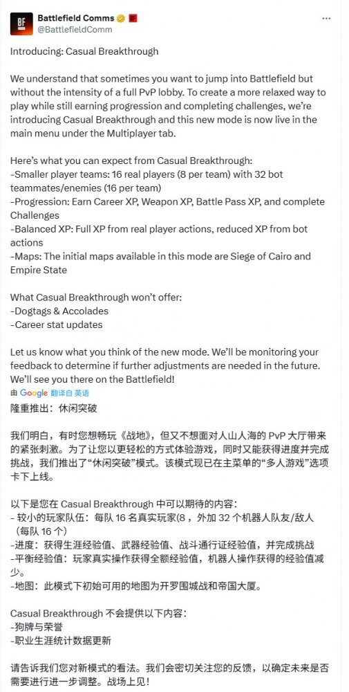 《战地》的死忠粉丝们始终觉得这种模式理应只出现在门户模式里,不过现在它真的来了。EA为《战地6》新增了“休闲突破”模式,该模式中加入了机器人bot,玩家在完成挑战、解锁相关内容的过程中,还能获取生涯、武器以及战斗通行证的经验值。