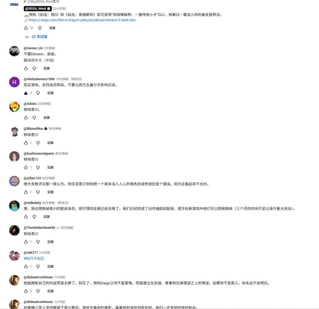 世嘉两周前的官方直播里,即便众多观众在弹幕中刷起相关话题,主持人却全程没有回应;而如今油管评论区已迅速被“#REMOVEKAGAWA”标签与大量批评留言所淹没。