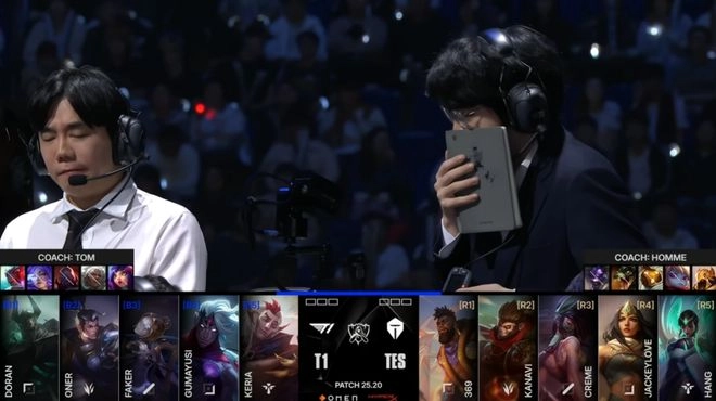 双方最终阵容敲定,TES选出奥恩、琪亚娜、兔子、德莱文、泰坦的强势节奏组合,T1则选出寒冰搭配烈娜塔的强势下路进行压制,中路选到对AL战中起到至关重要作用的梅尔,上野则选出了全图支援能力强大的塞恩与潘森配合艾希射箭,形成“全球流”。