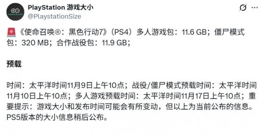 预购数字版的玩家在预载阶段就能直接获取最新版本更新,但在战役/僵尸模式于2025年11月10日上线前,以及多人模式11月17日正式开放前,或许还会发布补充性更新。购买实体版的玩家则需单独下载更新补丁。需要留意的是,PS4版的合作战役包、僵尸模式包与多人游戏包总容量为23.82 GB,还不到前作《黑色行动6》战役组合包1、2和多人游戏包总容量(50.231 GB)的一半。