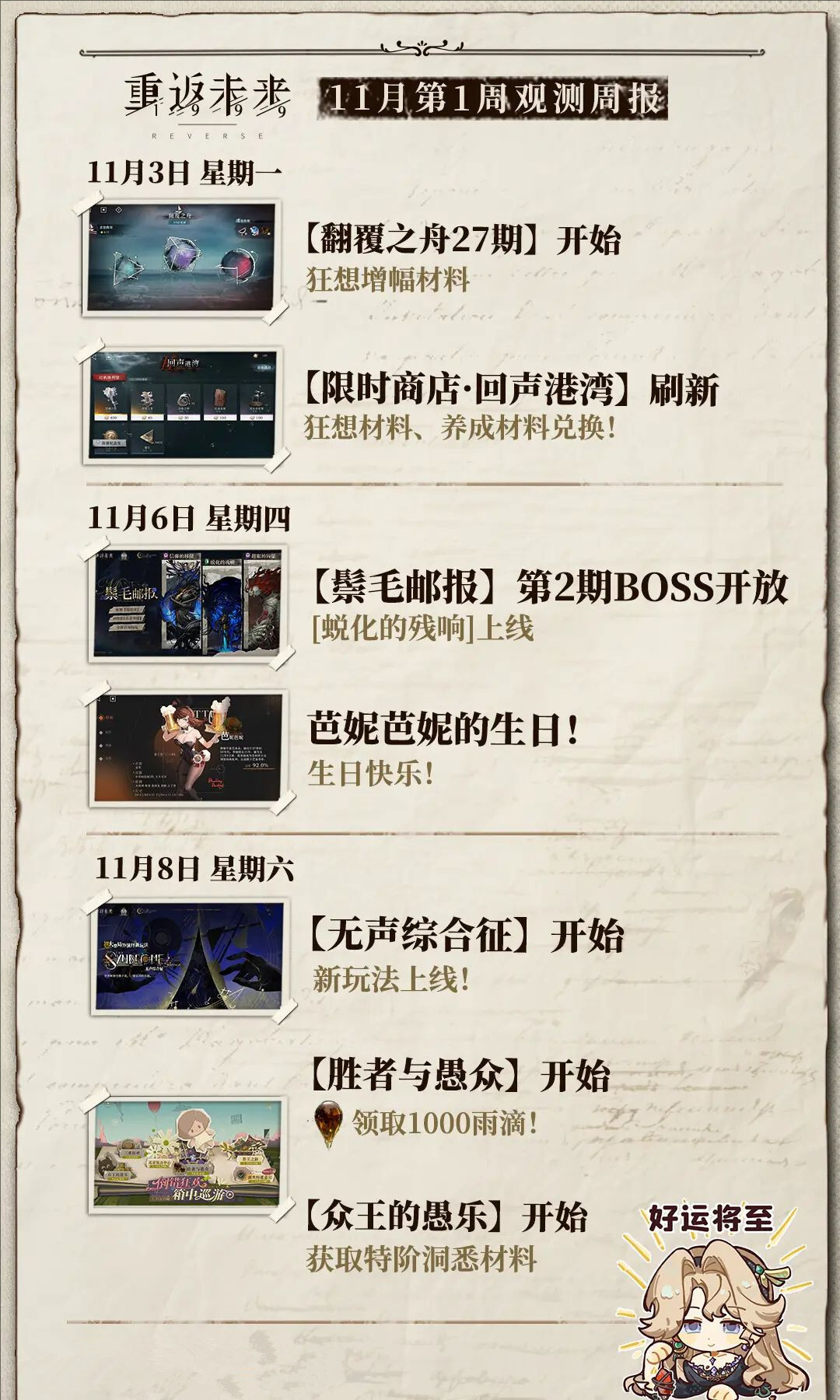 在重返未来1999的奇妙世界里,十一月1日观测周报已惊喜上线。资深观测员如期而至,为你盘点一周亮点:周一有翻覆之舟开启新篇、限时商店更新;周四鬃毛邮报BOSS挑战来袭,还有芭妮芭妮的生日庆典;周六更是多项活动同步开启——这场精彩的冒险盛宴千万别错过,快随我一同探索详情吧!