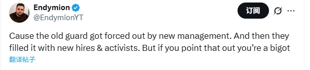 网友@EndymionYT回应道:“老一辈员工都被新管理层清退了,之后他们招入了新员工和激进派人士。可要是你点明这个情况,他们就会指责你是个偏执的人。”