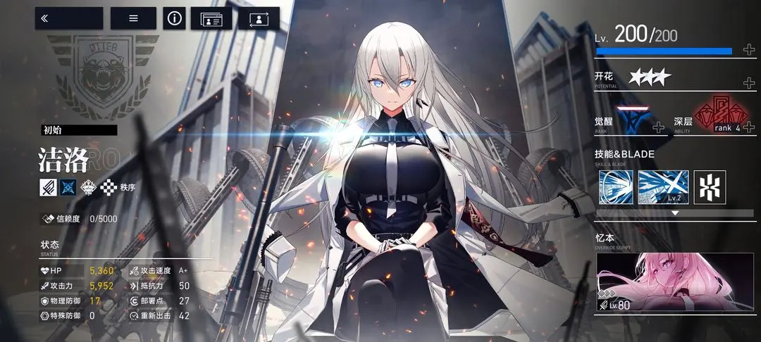 1.初始形态优势 身着白色制服的初始形态洁洛,在装备专属忆本后迎来质的飞跃,输出能力跃升至顶尖梯队。她的综合属性趋近六边形均衡分布,既能担当强力输出又具备可靠生存能力,是下塔挑战中优先培养的不二之选。