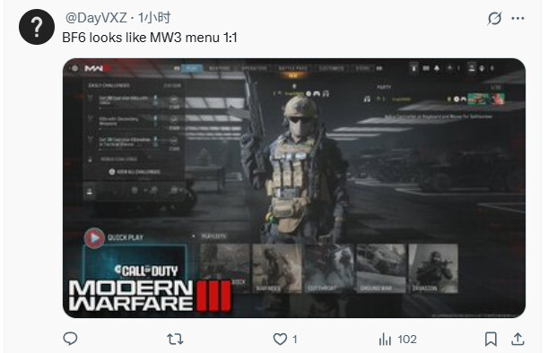 也有玩家指出,《战地6》的UI设计与《使命召唤:现代战争3》的几乎是一模一样的。