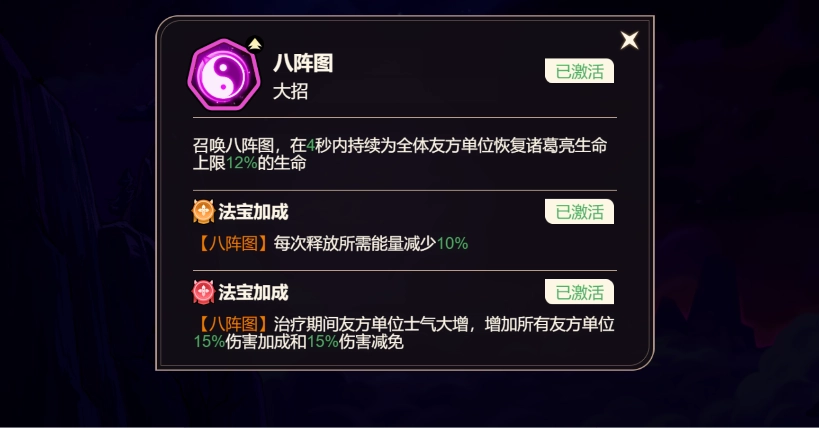 八阵图(初始技能):施展此技能可召唤八阵图,在接下来的4秒内,持续为全体友方单位回复相当于诸葛亮生命上限12%的生命值。该技能无论是在PVE场景还是PVP场景,均能发挥显著作用。此外,当配备法宝并获得其加成时,不仅能降低此技能释放所需的能量,还能提升友方单位的伤害加成与伤害减免效果。