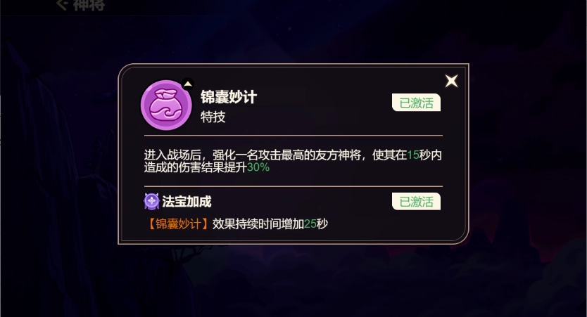 锦囊妙计(需神将达到2星方可解锁):在进入战场之后,会对一名攻击力最高的友方神将进行强化,让其在15秒内所造成的伤害结果提高30% 。(若与高输出神将搭配,能获得较大提升)此外,法宝加成可增加伤害提升的持续时长。