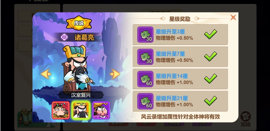 神将升星后可提升全体神将的伤害减免,物理增伤,魔法增伤。