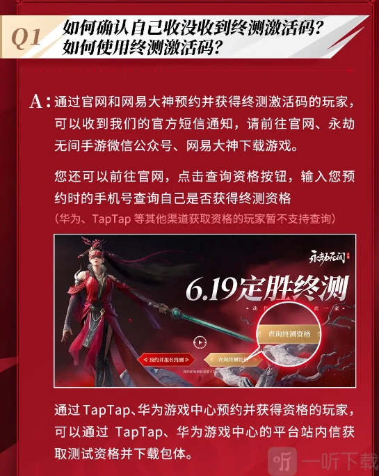 以上便是关于永劫无间手游终测的所有内容。此次测试开放的名额较为充足,有需求的小伙伴们赶快去申请领取资格吧。更多精彩的游戏攻略,欢迎关注一听下载网。