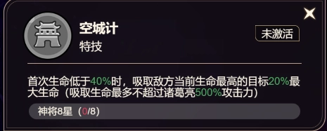 当生命值首次降至40%以下时,从敌方当前生命值最高的目标身上吸取其20%的最大生命值(吸取的生命值上限为诸葛亮攻击力的500%)。