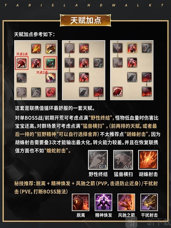 在塔瑞斯世界里,如今已上线9个职业,游侠便是其中一员。在这款游戏中,游侠是极受欢迎的职业之一,堪称荒野中的传奇猎手。作为荒野里的孤独猎手,游侠擅长运用武器与陷阱捕杀野兽。而且,这些野外生存的行家还具备与猛兽交流的能力,能让猛兽成为可靠的伙伴。不少小伙伴对游侠玩法中技能该如何加点不太清楚,今天小编就为大家带来游侠玩法的技能攻略,快来一起看看吧。