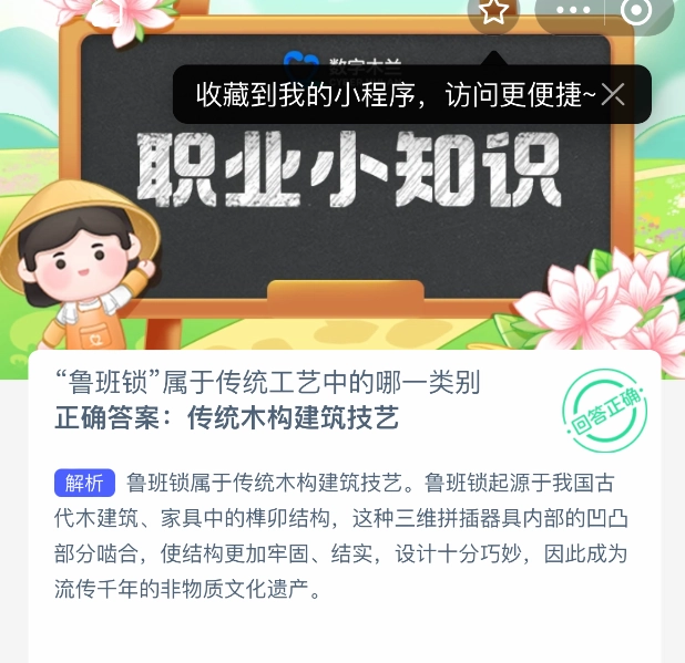 “鲁班锁”究竟属于传统工艺里的哪一类别呢?这可是支付宝蚂蚁新村2025年7月3日的题目哦。大家要知道,每天在蚂蚁新村参与答题,能够提升木兰币的产出速度,助力小镇建设。要是点击了正确答案,就能得到“产速 + 3/时”,要是答错了,就只有“产速 + 1/时”的效果。而今天这道题的正确答案是【传统木构建筑技艺】,没错,鲁班锁就属于传统木构建筑技艺。鲁班锁源自我国古代木建筑以及家具当中的榫卯结构,这种三维拼插器具内部的凹凸部位相互啮合,从而让整体结构变得更为牢固、坚实。