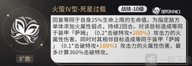 由于强化战技只能为主目标施加火弱点,该技能使扩散的目标即使没有弱点也依旧会被削韧,优化了对抗群体敌人时的破盾效率,使得能够更快击破。