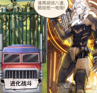 3、对两边的地板进行修补,之后下方会出现【进化战斗】这一选项,点击汽车,汽车便会化为人形,从而顺利通关。
