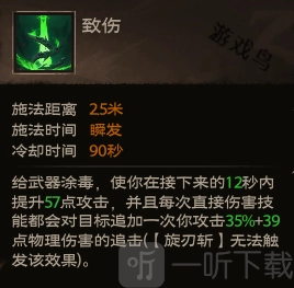 效果:对武器进行涂毒操作,在后续的12秒内,你的攻击力将提升57点。而且每次使用直接伤害技能时,除技能本身伤害外,还会对目标额外追加一次物理伤害的追击,追伤数值为你攻击力的35%再加上39点(需注意,【旋刃斩】无法触发此追加效果)。