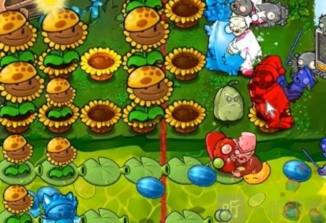 3. 接着在左边补种一列阳光向日葵,于水池里栽种多个豌豆荷叶以及寒冰西瓜猫蒲。