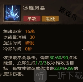效果:此技能无法产生暴击。需消耗30/60/90点冰能量,随即瞬间生成1/2/3枚冰锥对目标发动攻击,每一枚冰锥可造成相当于你攻击力220%加上259点的魔法伤害。