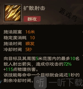 效果:向目标及其周围5米范围内的最多10名敌人射出箭矢,造成你攻击的72%6+115点物理伤害。