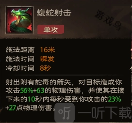 效果:射出带有蛇毒的箭矢,对目标造成相当于你攻击力56%加上63点的物理伤害,且在后续10秒内,目标每秒会受到攻击力23%加上27点的物理伤害。