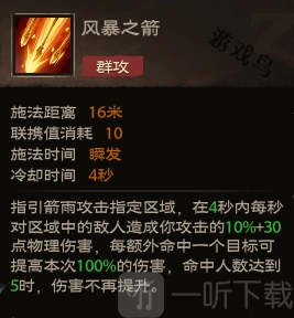 效果:引导箭雨对指定区域发动攻击,在4秒的时间里,每秒会对该区域内的敌人造成相当于你攻击力10%加上30点的物理伤害。每次额外命中一个目标,本次伤害就能提高100% ,不过当命中人数达到5人时,伤害便不再增加。