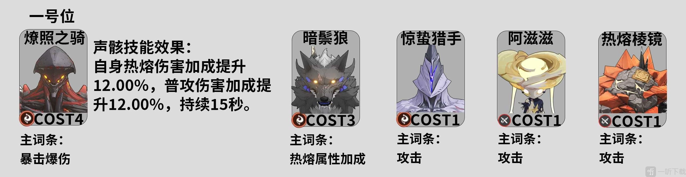 4级声骸建议选择燎照之骑,这不仅能够提升炽霞的伤害数值以及技能输出能力,同时还能强化大招与火属性的伤害加成效果。