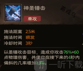 效果:运用圣锤对目标发起攻击,造成相当于你攻击力76%加上60点的物理伤害,同时在后续的4秒内,使你偏斜的几率提升13%。