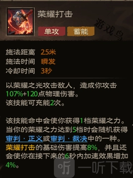 施展此技能并命中目标后,你将获取1档荣耀之力。一旦你的荣耀之力累计至5档,便会随机得到审判·正义或审判·裁决其中之一。同时,荣耀打击的基础伤害提升8%,而且在技能命中后的6秒内,你的加速效果额外增加4%。