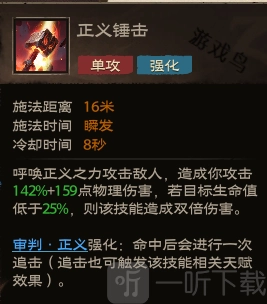 审判·正义强化:命中后会进行一-次追击(追击也可触发该技能相关天赋效果)。