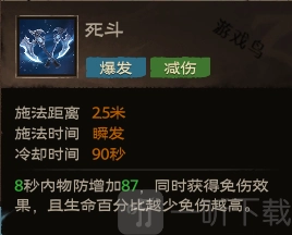 效果:8秒内物防增加87,同时获得免伤效果,且生命百分比越少免伤越高。