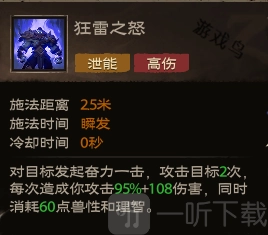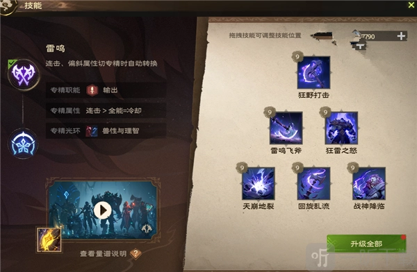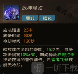 效果:激发体内潜藏的所有能量,在15秒内,自身攻击力提升10%并额外增加30点。在此期间,释放狂野打击技能所获取的兽性翻倍,同时雷鸣飞斧技能无需冷却即可使用。