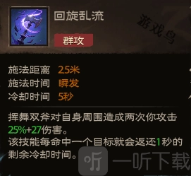 效果:挥动双斧,对自身周边造成两次等同于你攻击力25%加上27的伤害。此技能每击中一个目标,便会将剩余冷却时间减少1秒。
