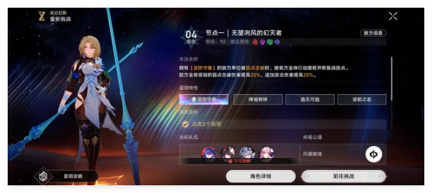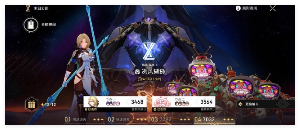 上半可选的增益包括击破加成、量子伤害加成以及持续伤害加成,适合用dot队、击破队来应对。其中,量子伤害加成实际上是高练度希儿或翡翠的专属增益,不过经亲自测试,希儿的量子纯色队无法通关4层上半。下半的增益为击破加成、普攻战技加成以及同协拉条加成,同样可用击破队、饮月队、镜流队来挑战,但需要留意敌人弱点。