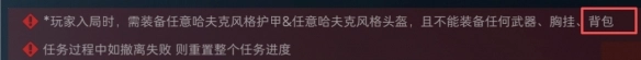 虽然文本描述明确规定不能携带武器、胸挂和背包,但小编实际测试后发现,只要将武器放在背包里携带,就不会触发任务失败的判定。