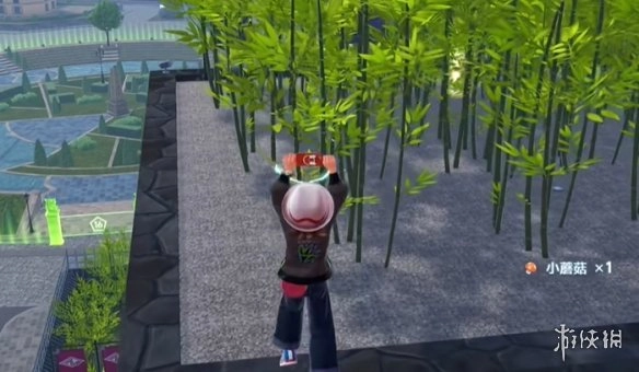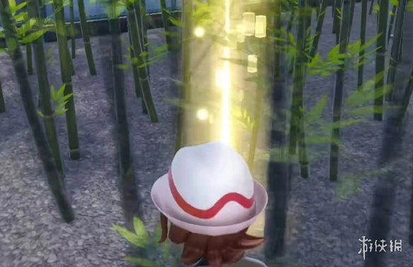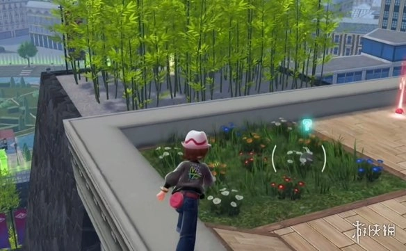 3、玩家上去之后,会看到左侧有一个屋顶,屋顶上面长满了竹子,此时使用滑翔功能落到屋顶上即可。