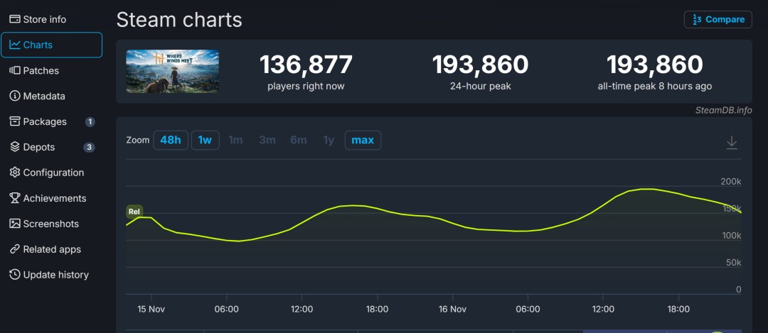 这款游戏当前能在PC平台(包含Steam与Epic Games Store)以及PS5上免费获取。根据非官方的Steam数据库网站SteamDB的数据,在本文写作之际,Steam平台上该游戏的同时在线玩家最高数量已经突破了19.3万。