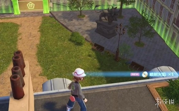 玩家首先要传送至17号野生特区,抵达后直接进入。进入特区后左转,沿着台阶向上走。到达台阶顶端后不要停下,继续左转直走,在特区门口的左侧能看到一架梯子。顺着梯子爬上去,上去之后左转,跳上蓝色的屋顶。在屋顶平台的左上角,玩家会看到一道金光,捡起那里的宝可梦球,就能获得喷射火焰的招式学习器了。