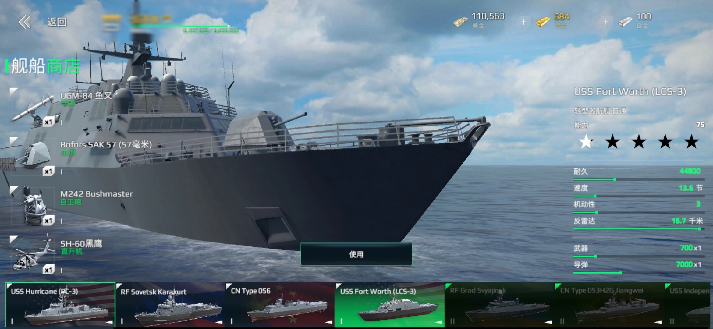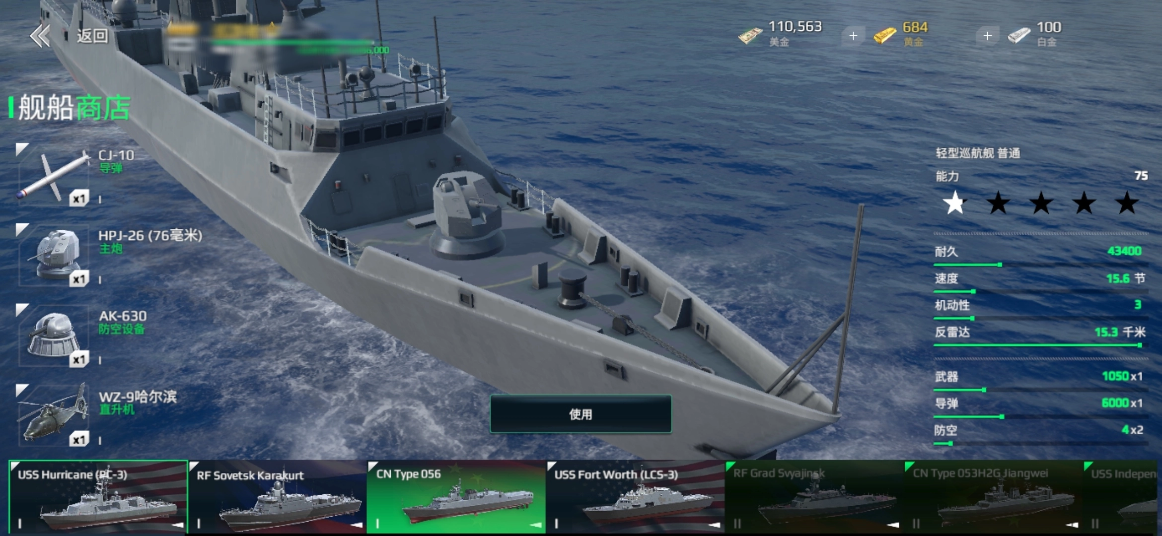 该船耐久介于飓风号与056型之间,和056型一样配备直升机,售价20万美金,在一级船中装备数量最多。它拥有一座自卫炮,与主炮配合在近战方面具备优势。主炮为Bofors SAK 57(57毫米),伤害值780,炮弹投射量为5连发。UGM - 84鱼叉导弹伤害达7000,高于AGM - 176和CJ - 10。不过,它和PC - 3一样存在缺点,即没有防空设备,在对战人机时问题不大,但在对战玩家时,这两艘船都会成为玩家重点打击的目标。(参考建议:有意购买的玩家可将导弹换成俄制的,主炮换成国产的。)