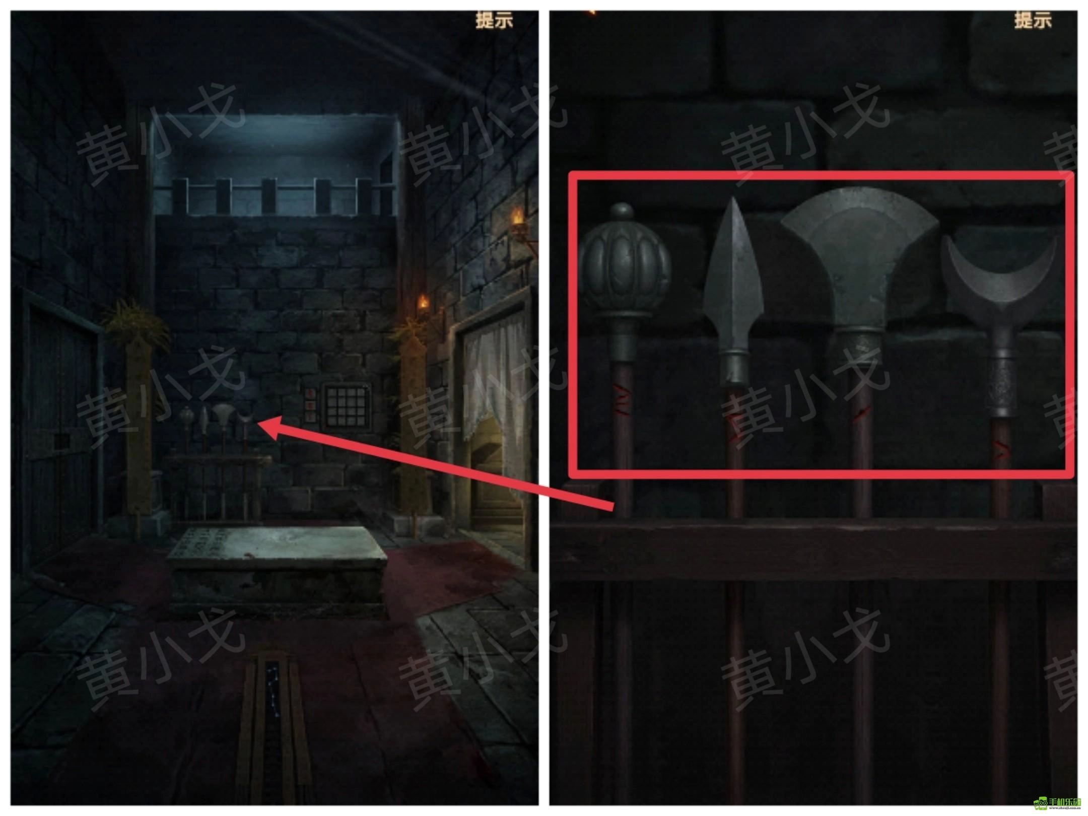 4、点击石桌上的盒子,根据[主殿]武器架上武器的形状和红线数量,调整密码锁
