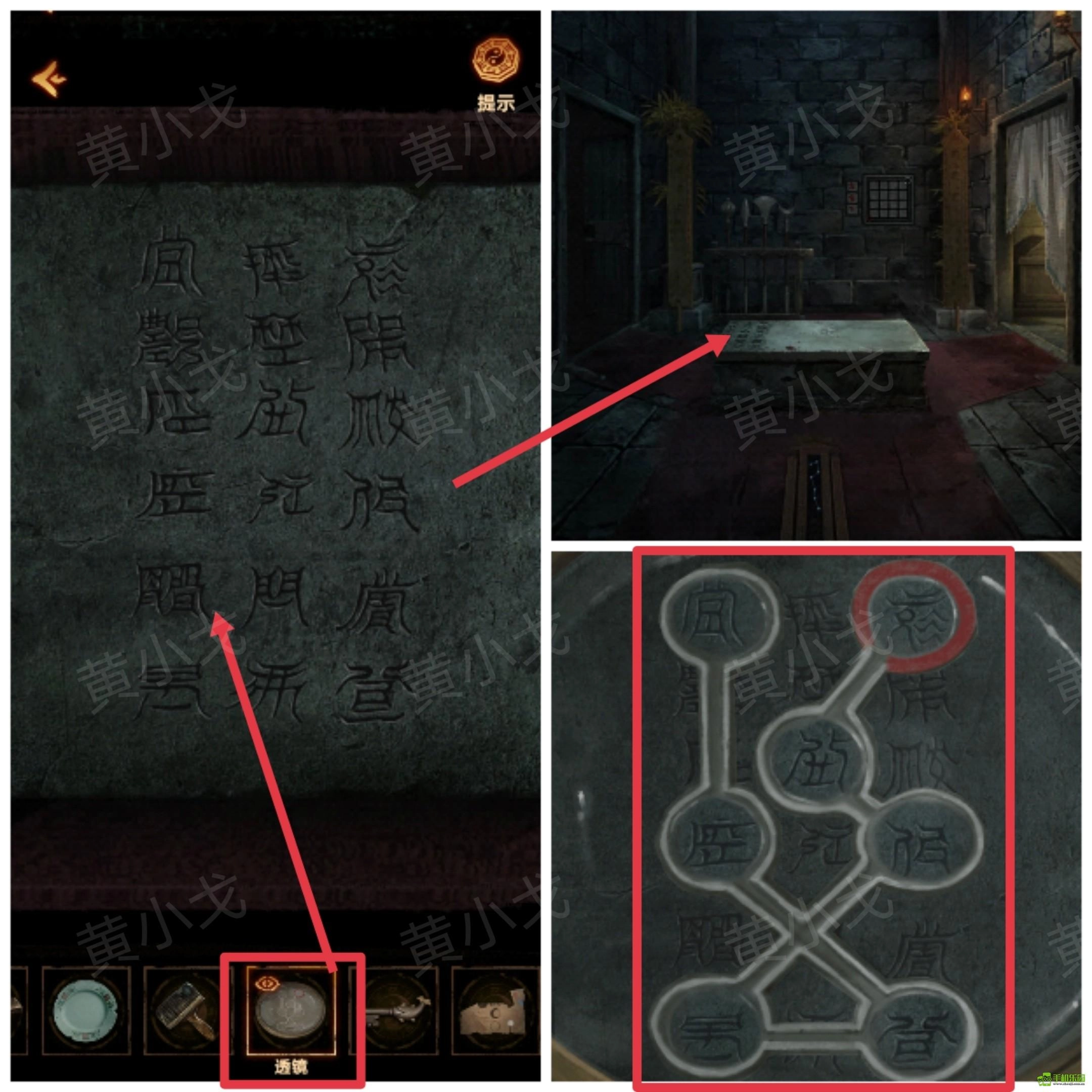 13、点击石床上的字,使用【透镜】,获得线索