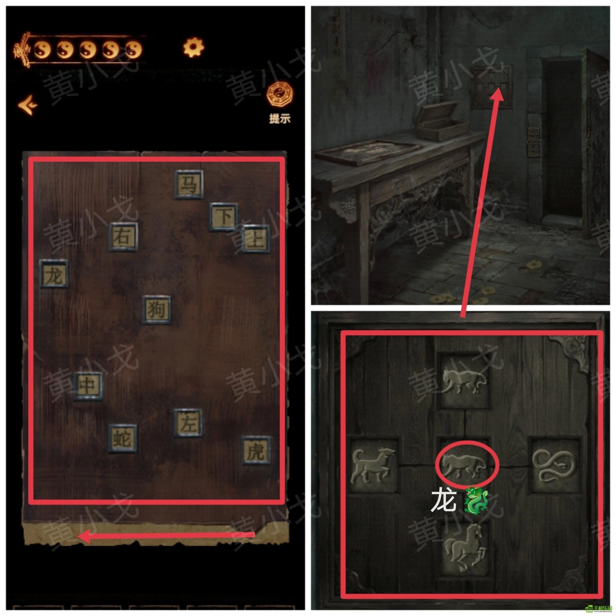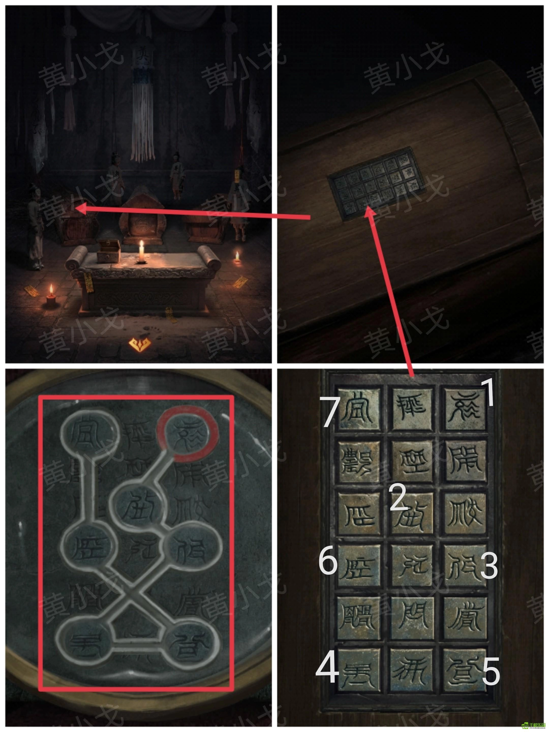 14、点击左侧棺材上的机关,根据[主殿]石床上的线索,按顺序按下字按钮,打开棺材