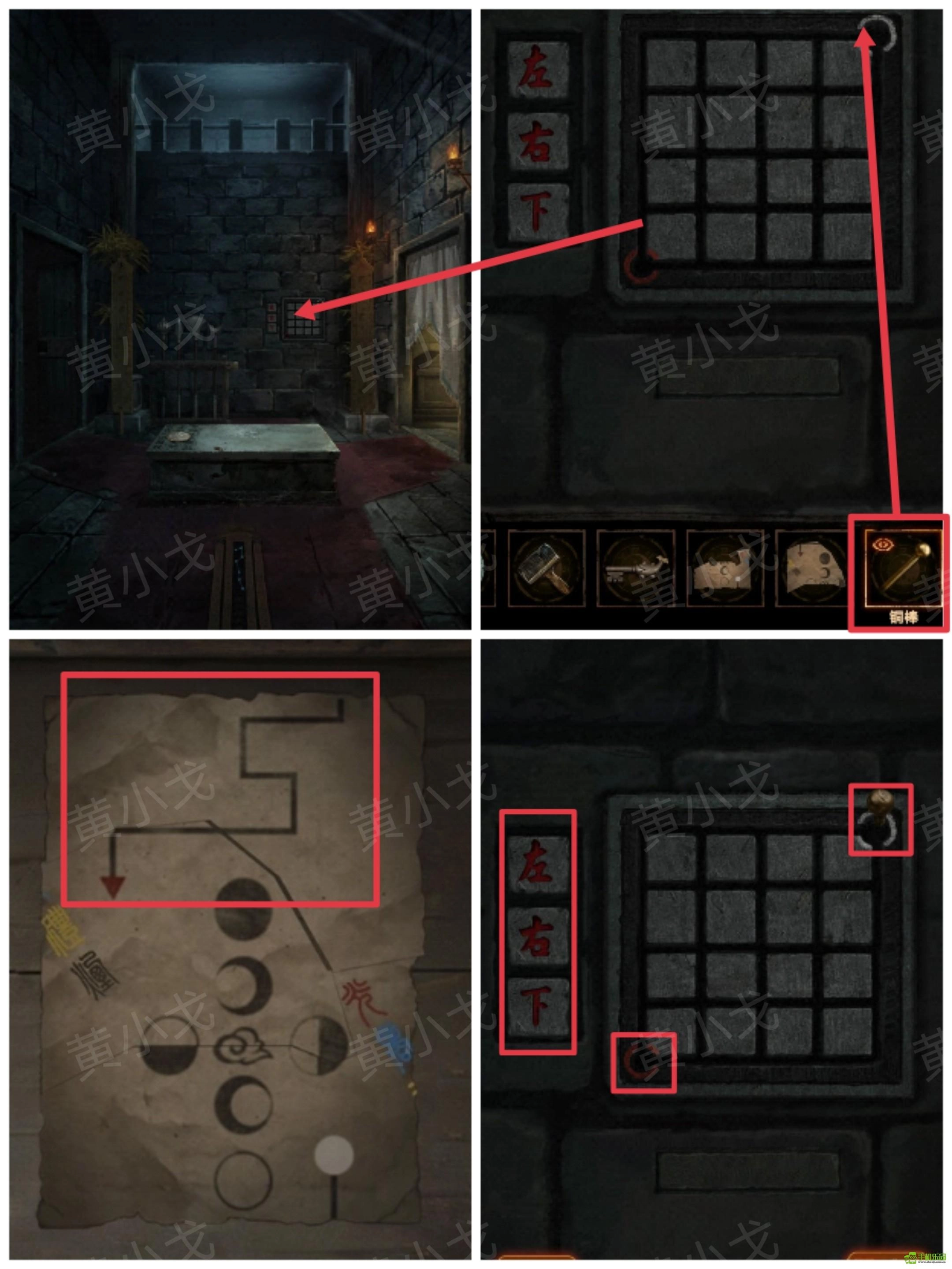 23、点击墙上的机关,装上【铜棒】;根据拼好的下卷纸张上的路线,按顺序按下按钮