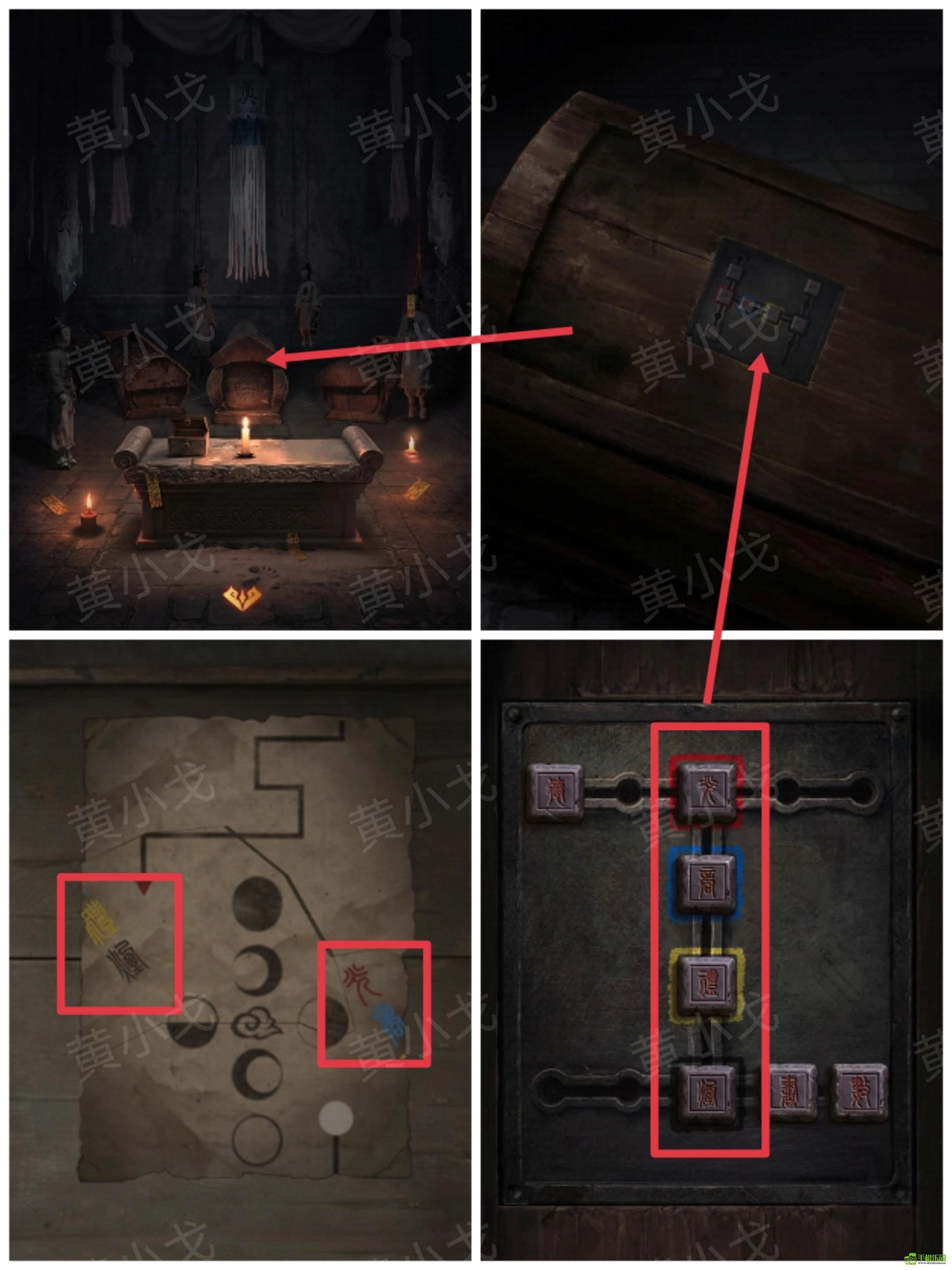 25、点击中间的棺材上的机关,根据拼好的下卷纸张上的线索,调整符号滑块的位置