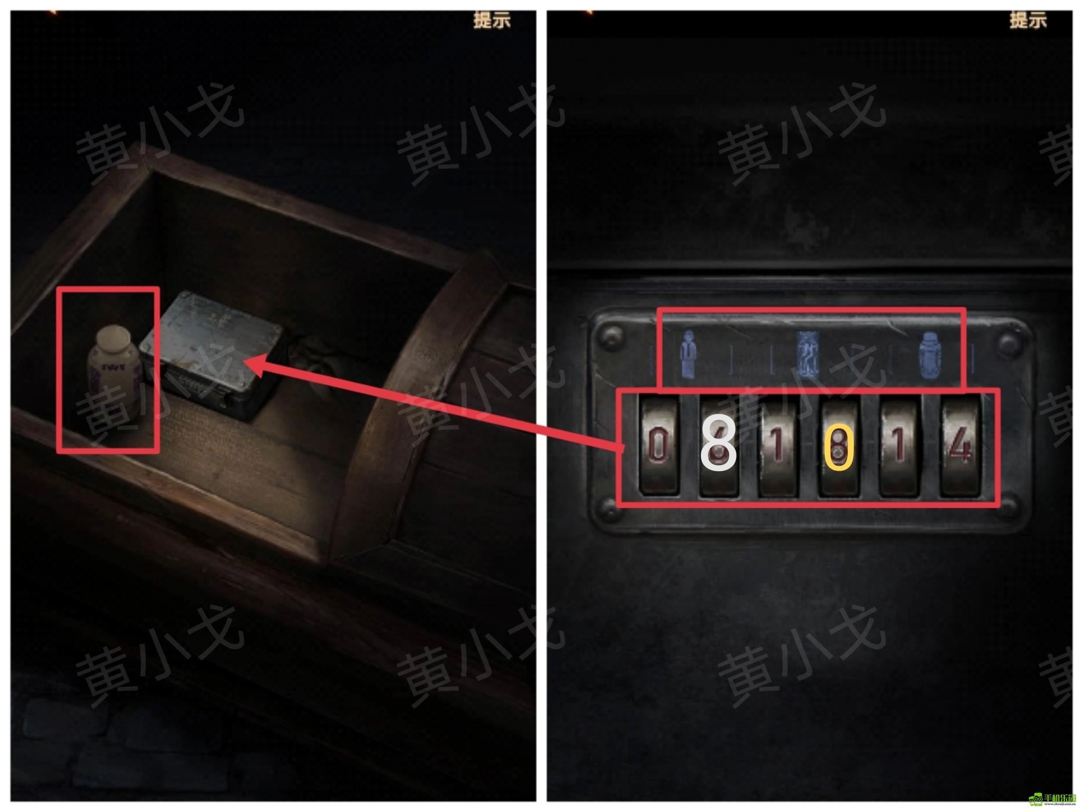 28、点击棺材内盒子上的密码锁,依据其上的图案提示,再结合各个场景里对应物品的数量,输入密码:08 10 14