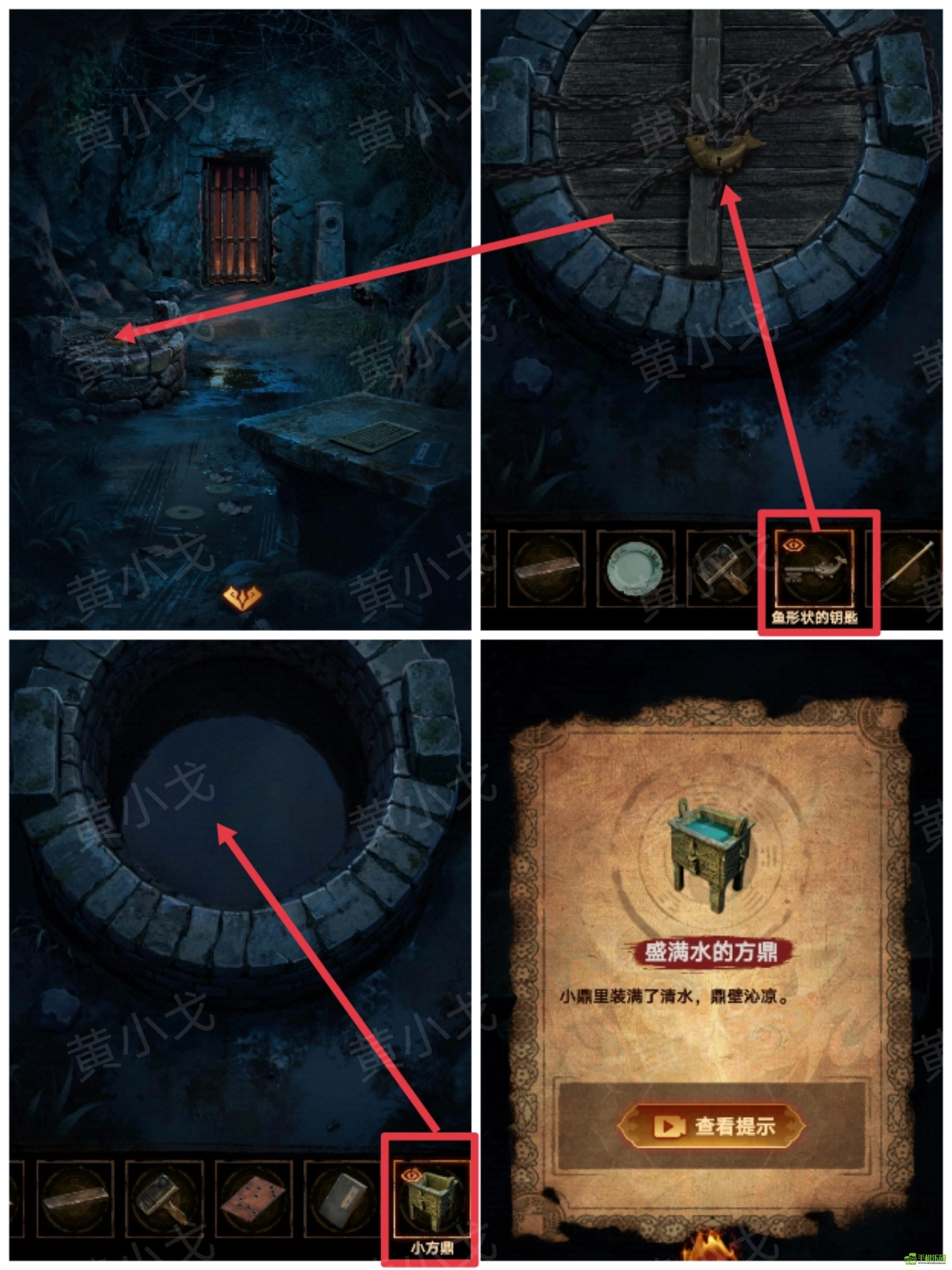 30、用【鱼形状的钥匙】打开水井上的锁;再用【小方鼎】装水,获得【盛满水的方鼎】
