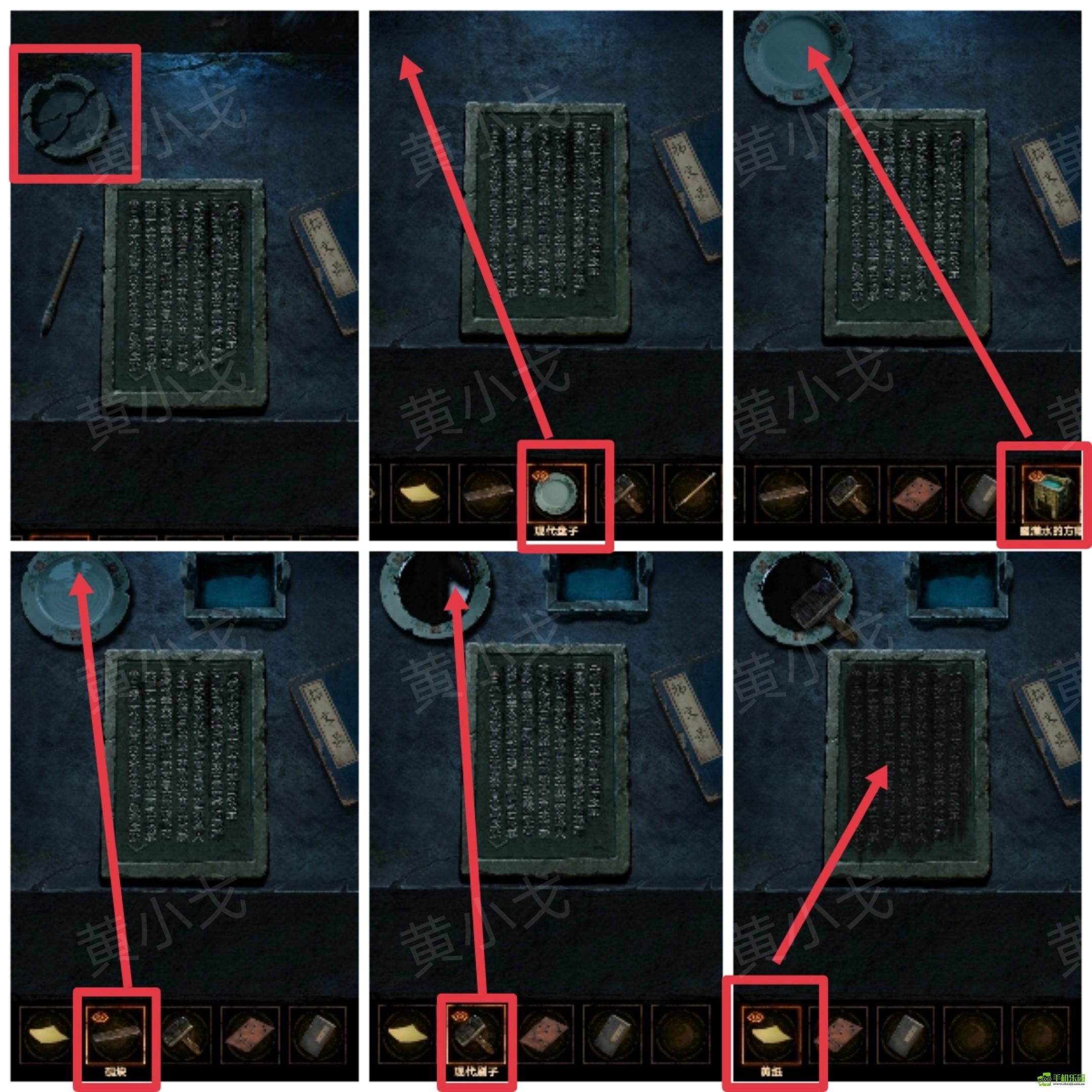 31、点击石桌,移开破砚台,放上【现代盘子】,倒入【盛满水的方鼎】里的水,放入【砚块】和【现代刷子】,再铺上【黄纸】